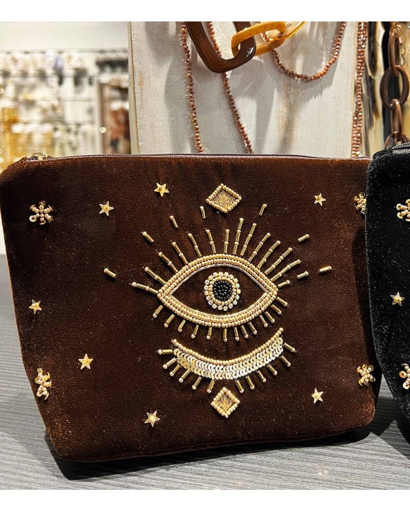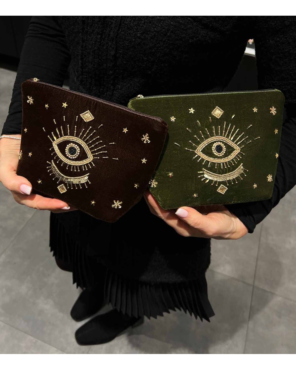 Apportez une touche mystique et sophistiquée à votre look avec cette pochette en velours brodée d’un œil protecteur, symbole de chance et de protection.